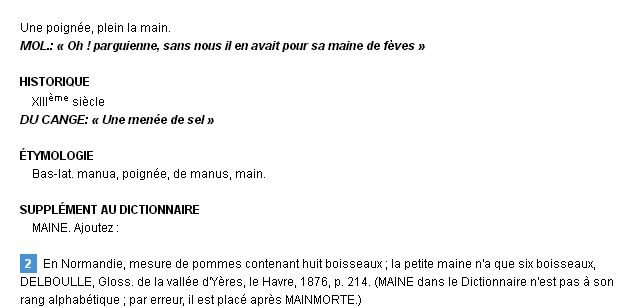 Cette définition du terme maine a été numérisée par Paulette et Jacques de l'équipe du site.